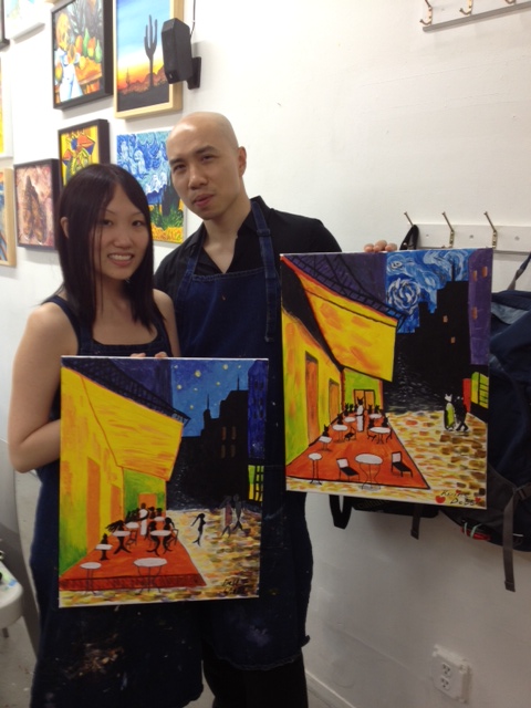 The art class was great. We enrolled people to give us their front row seats. We traced a Picasso picture called “Cafe Terrace at Night.” Interestingly, the place really does exist in Paris!